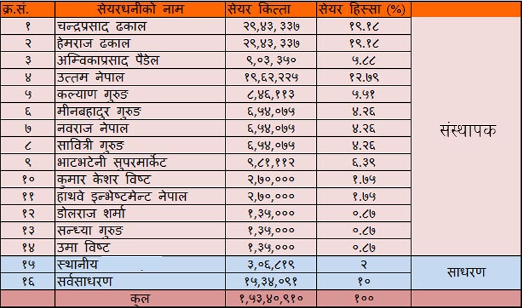 यस्तै, कम्पनीमा अम्विकाप्रसाद पौडेल ९ लाख ३ हजार १५० कित्ता, कल्याण गुरुङ ८ लाख ४६ हजार ८१३, मीनबहादुर गुरुङ, नवराज नेपाल, सावित्री गुरुङको समान ६ लाख ५४ हजार ७५ कित्ता सेयर रहेको छ । अन्य ५ जनाको ६ लाख ६५ हजार कित्ता सेयर रहेको छ ।