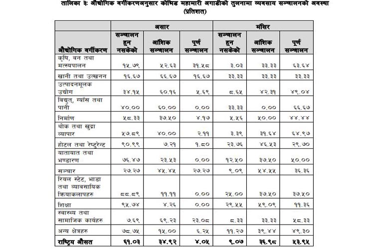 सञ्चारतर्फ ४२.२७, रियलस्टेट, भाडा तथा व्यावसायिक क्रियाकलाप ४६.४३, शिक्षा ३७.५८, स्वास्थ्य तथा सामाजिक कार्य ५२ र अन्य क्षेत्र क्रमशः ४४ प्रतिशत सञ्चालनमा आएको केन्द्रीय बैंकले जनाएको छ । गत असारको तुलनामा उद्योग–व्यवसायको उत्पादन तथा कारोवारको अवस्थामा सुधार आएको केन्द्रीय बैंकले जनाएको छ ।