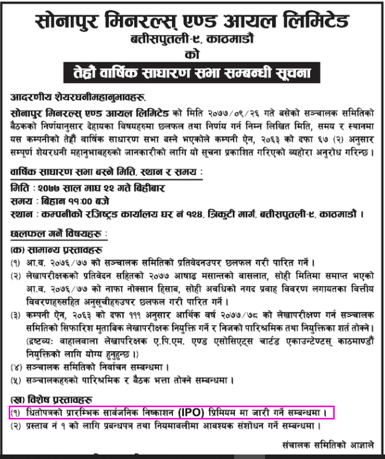 यस्तै, कम्पनीले साधारण सभामा वार्षिक प्रतिवेदन पेश गर्ने, आर्थिक वर्ष २०७६/७७ को वासलात, नाफा नोक्सान हिसाब र नगद प्रवाह विवरणमा छलफल गरी पारित गर्ने, संचालक समितिको निर्वाचन गर्ने लगायत प्रस्ताव मुख्य एजेण्डाको रुपमा लैजाने भएको छ ।