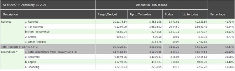 कोरोनाका बाबजूद आधा अवधिमा लक्ष्यको ४२ प्रतिशत राजश्व संकलन हुनुले आर्थिक वर्षको अन्त्यसम्ममा लक्ष्य अनुसार नै राजश्व संकलन हुने संकेत देखिन्छ ।