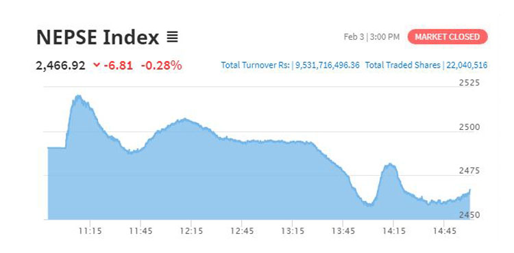 बजार खुल्न साथ करिब ४६ अंकले बढेको बजार अन्त्यमा ६ अंकले घटेर बन्द भएको हो । मंगलबार ६५ अंकले बढेर नेप्से इतिहासकै उच्च २४७३.७४ विन्दुमा पुगेको थियो ।