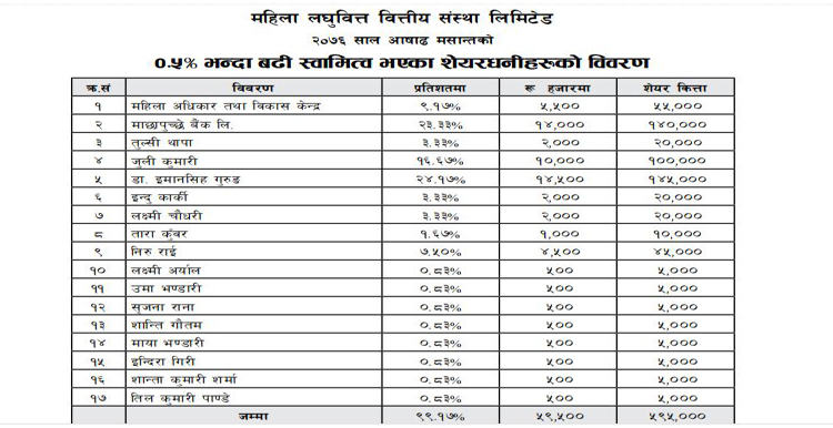 यसैगरी, लघुवित्तको प्रमोटर सेयर होल्डरको रुपमा महिला बालबालिका तथा ज्येष्ठ नागरिकमन्त्री जुली कुमारी महत्तोको १ करोड रुपैयाँ बराबरको १ लाख कित्ता, महिला अधिकार तथा विकास केन्द्रको ५५ हजार कित्ता, निरु कथुनी राईको ४५ हजार कित्ता र अन्य विभिन्न व्यक्तिहरुको १ करोड ५ लाख रुपैयाँ को सेयर रहेको छ ।