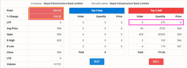 बजार खुल्नसाथ करिब ३५ अंकले बढेको बजार टीएमएसमा एकैचोटी ८१ अंक ऋणत्मक देखाएको थियो । यस्तै, नेपाल इन्फ्रास्ट्रक्चर बैंको सेयर १०० प्रतिशत ऋणत्मक देखाएको छ । नेप्सेको नियम अनुसार कुनै पनि कम्पनीको सेयर मूल्य एक कारोबार दिनमा बढीमा १० प्रतिशतभन्दा घट/बढ हुन नपाउने व्यवस्था छ ।
