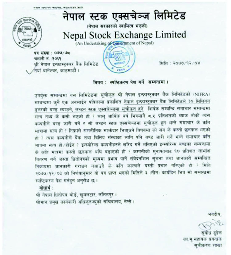 संचारमाध्यमहरुमा धितोपत्र मूल्यमा प्रभाव पर्ने समाचारहरु आएको भन्दै नेप्सेले ३ दिनभित्र स्पष्टिकरण बुझाउन निफ्रालाई भनेको हो । विभिन्न संचारमाध्यममा निफ्राले ३० मिलियन डलरको बन्ड जारी गर्ने र लण्डन स्टक एक्सचेन्जमा सूचीकृत गराउने विषय समाचार आएपछि त्यसको सत्यतथ्य के हो भन्ने बारे ३ दिन भित्र स्पष्टिकरण दिन भनेको छ ।