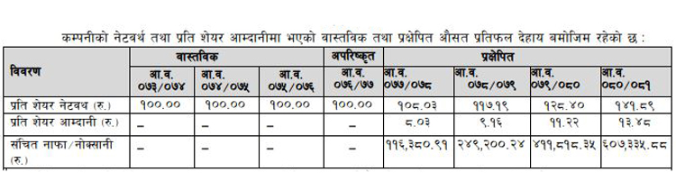 अघिल्लो ४ आर्थिक वर्षको सञ्ति नाफा उल्लेख नगरेको कम्पनीको चालू आर्थिक वर्षसम्म ११ करोड ६३ लाख ८० हजार सञ्चित नाफा रहेको छ । कम्पनीले आगामी ३ वर्ष (आव २०८०/८१)सम्म यस्तो नाफा ६० करोड द७३ लाख पुर्याउने प्रक्षेपण गरेको छ ।