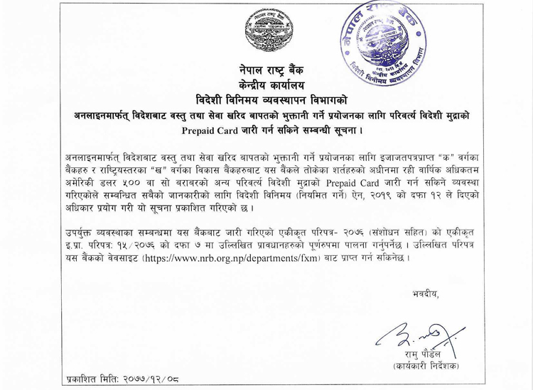 राष्ट्र बैंकले वार्षिक रुपमा अधिकतम ५०० अमेरिकी डलरसम्मको भुक्तानी गर्न मिल्ने गरी यस्तो नियम बनाएको हो ।परिवर्त्य विदेशी मुद्राको प्रिपेड कार्ड लिन चाहने व्यक्ति, फर्म, कम्पनी वा संस्थाको बैंक खातामा रहेको नेपाली रुपैयाँलाई सटही गरी त्यस्तो कार्ड जारी गर्न सकिने भएको छ ।