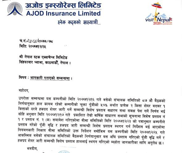 बीमा समितिको यही चैत २३ गतेको पत्रानुसार कम्पनीले प्रस्ताव गरेको पूँजी वृद्धि र हकप्रद जारी गर्ने निर्णय स्थगित गरिएको कम्पनीले जनाएको छ ।