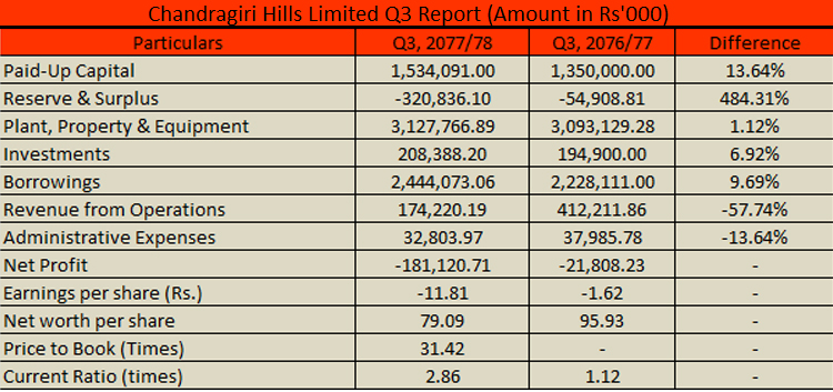 काठमााडौं । चन्द्रागिरी हिल्स लिमिटेडको घाटा गत वर्षको तुलनामा १५ करोड ९३ लाख रुपैयाँले बढेको छ ।