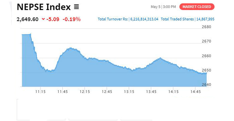 आज सेयर बजार मापक सूचक नेप्से ५.०९ अंकले घटेर२६४९.६० विन्दुमा आइपुगेको छ । नेपाल स्टक एक्सचेन्जका अनुसार आज २१८ कम्पनीको ६ अर्ब २१करोड ६८ लाख १४ हजार ३१३ रुपैयाँ बराबरको १ करोड ४८ लाख ६७ हजार ९९५ कित्ता सेयर किनबेच भएका छन् ।