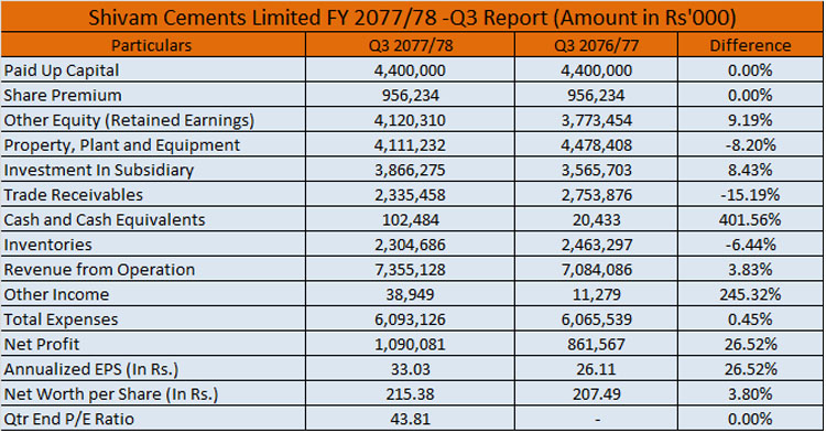 काठमाडौं । शिवम् सिमेन्टले खुद नाफामा २६.५२ प्रतिशतले वृद्धि गरेको छ । कम्पनीले बुधबार सार्वजनिक गरेको चालू आर्थिक वर्षको तेस्रो त्रैमासको वित्तीय विवरण अनुसार चैत मसान्तसम्म १ अर्ब ९ करोड खुद मुनाफा कमाएको छ ।