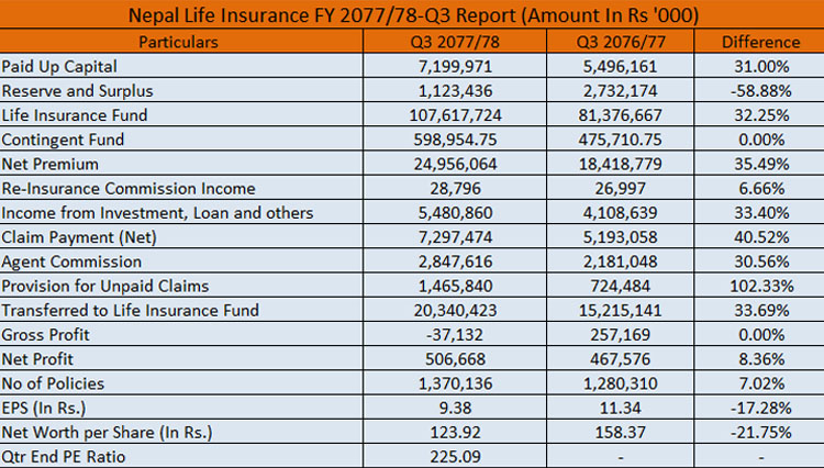 हाल ७ अर्ब १९ करोड चुक्ता पूँजी रहेको कम्पनीको रिजर्भ कोषमा १ अर्ब १२ करोड रुपैयाँ संचित छ । समीक्षा अवधिमा कम्पनीको जीवनमा कोषको आकार ३२.२५ प्रतिशतले बढेर १ खर्ब ७ अर्ब रुपैयाँ पुगेको छ । खुद बीमा शुल्क ३५.४९ प्रतिशतले बढेर २४ अर्ब ९५ करोड भन्दा बढी पुगेको छ ।