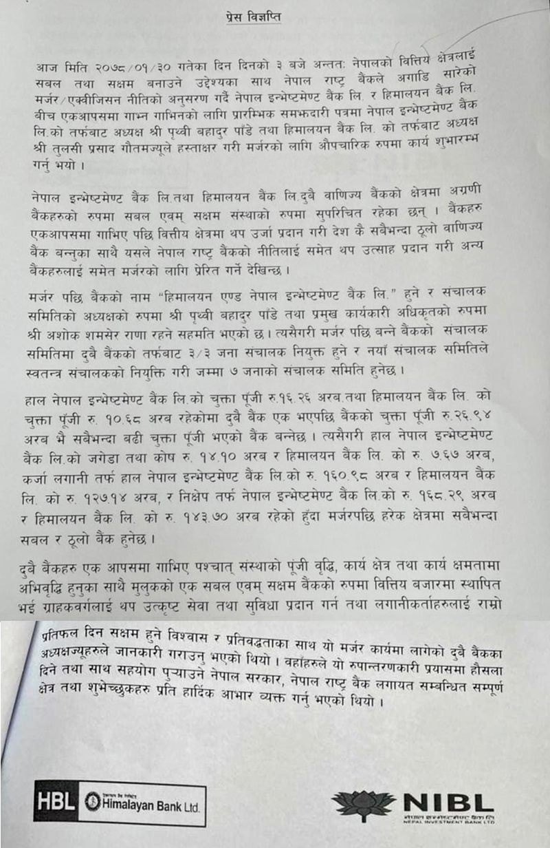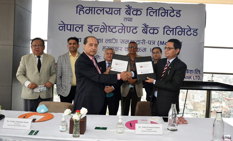 मर्जर सम्बन्धी सम्झौतापत्रमा नेपाल इन्भेष्टमेन्ट बैंकका अध्यक्ष पृथ्वीबहादुर पाँडे र हिमालयन बैंकका अध्यक्ष तुलसीप्रसाद गौतमले हस्ताक्षर गरे ।