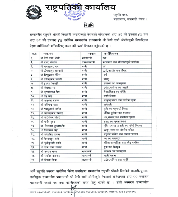 ओली संविधानको धारा ७६ (३) अनुसार अल्मपतको सरकारको प्रधानमन्त्री बनेका हुन् । सपथ लिएसँगै ओलीले मन्त्रिपरिषद् गठन गरेका छन् ।