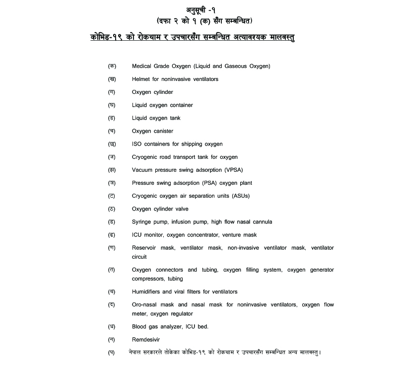 भन्सार ऐन २०६४ को दफा ९३ अनुसार विभागले उक्त कार्यविधि लागू गरेको जनाएको छ । नयाँ कार्याविधि लागू भएसँगै अब कोरोना रोकथामका लागि अत्यावश्यक वस्तहरु अक्सिजन सिलिण्डर, भेन्टिलेटर, लिक्वीड अक्सिजन, आइसीयू मनिटर, बेड, रेम्डिसिभिर लगायत २१ वस्तु सहजै आयात गर्न सक्नेछन् ।