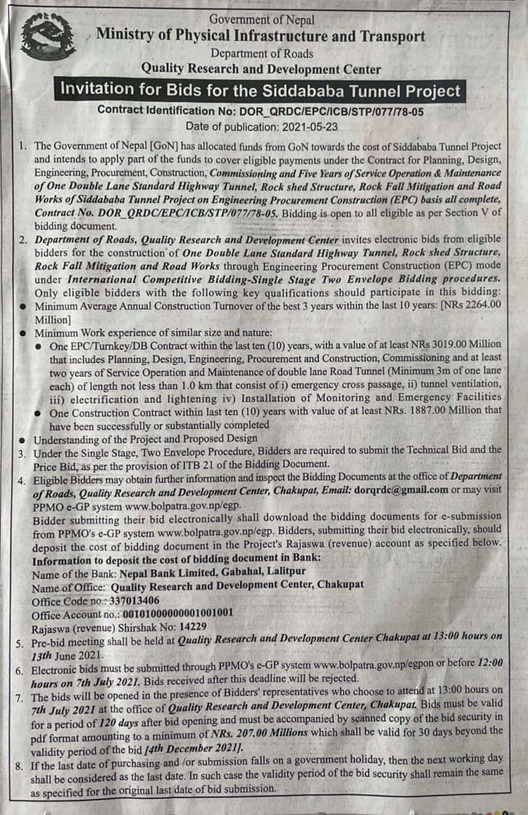 भौतिक पूर्वाधार मन्त्रालयले आइतबार एक सूचना प्रकाशित गर्दै उक्त सुरुङमार्ग निर्माणका लागि ४५ दिनको म्याद राखेर ग्लोबल टेन्डर आह्वान गरेको हो ।