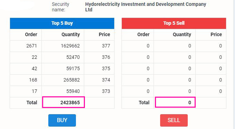 कारोबार खुलेको २५ मिनेट (११ः२५ बजेसम्म) कम्पनीको २३ लाख ७० हजार बढी कित्ता खरिदका लागि अर्डर भएको छ । जबकी विक्री कर्ता भने शून्य रहेका छन् ।