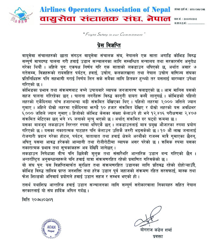 निजी क्षेत्रका वायुसेवा प्रदायक कम्पनीहरुको छाता संगठन वायुसेवा संचालक संघ, नेपालले एक विज्ञप्ति जारी गर्दै आन्तरिक उडान संचालन गर्न माग गरेको हो ।