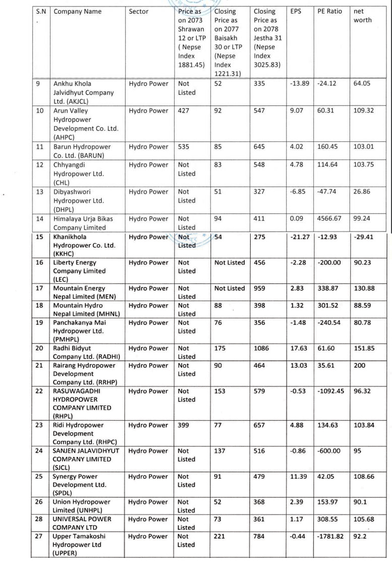 बोर्डका अनुसार सबैभन्दा धेरै हाइड्रोपावर कम्पनीको सेयर मूल्यमा चलखेल भएको छ । बोर्डले सार्वजनिक गरेको ५१ वटा कम्पनीमधये २० वटा हाइड्रो कम्पनी रहेका छन् ।
