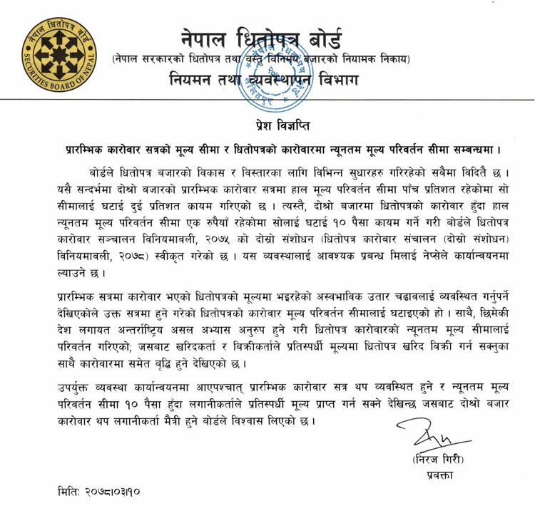 हाल सेयर कारोबार गर्दा रहेको न्यूनतम सीमा १ रुपैयाँलाई परिवर्तन गर्दै बोर्डले १० पैसा कायम गर्न लागेको हो । प्रिसेसनमा धितोपत्रको कारोबारमा हुने अस्वभाविक उत्तरुचढावलाई नियन्त्रण गर्न यस्तो व्यवस्था गरिएको बोर्डले जनाएको छ ।