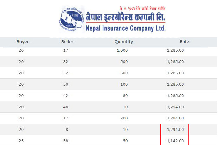 अन्तिम पटक ५० कित्ता सेयर काराेबार हुँदा सेयर मूल्य एकैपटक १२ प्रतिशतले घटेपछि लगानीकर्ता आक्रोशित भएका छन् । उक्त सेयर ब्रोकर नं. ५८ बाट विक्री भई ब्रोकर नं. २५ नं. बाट खरिद भएको छ ।