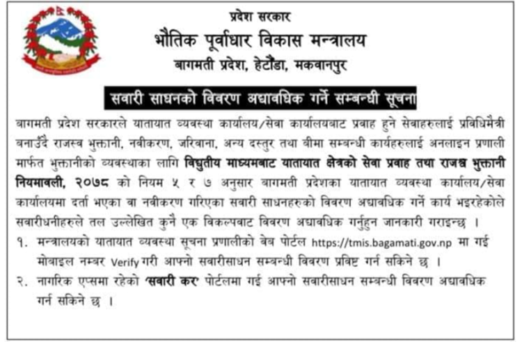 वाग्मती प्रदेश, भौतिक पूर्वाधार विकास मन्त्रालयले एक सूचना प्रकाशित गर्दै यातायात व्यवस्था कार्यालय तथा सेवा कार्यालयबाट प्रवाह हुने सेवाहरूलाई प्रविधिमैत्री बनाउँदै अनलाइन प्रणालीमार्फत राजश्व भुक्तानीको व्यवस्था गर्न लागिएको जानकारी गराएको छ ।