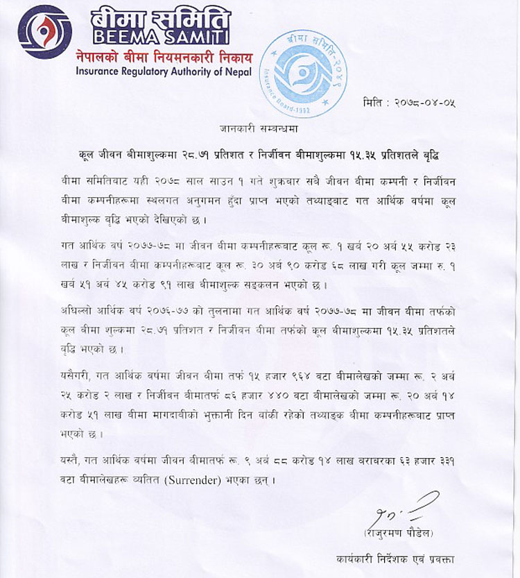 यस्तै, गत आवमा निर्जीवन बीमा कम्पनीहरुले ३० अर्ब ९० करोड ६८ लाख रुपैयाँ बराबरको बीमाशुल्क आर्जन गरेका छन् । यो अघिल्लो आवको तुलनामा १५.३५ प्रतिशतले बढी हो ।