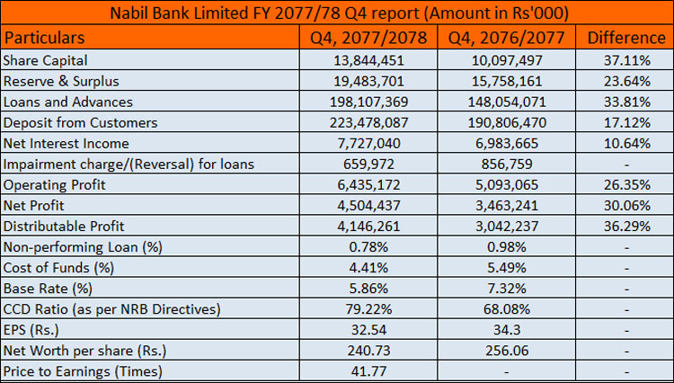 बैंकले सोमबार सार्वजनिक गरेको गत आव २०७७/७८ को चौथो त्रैमाससम्मको अपरिष्कृत वित्तीय विवरण अनुसार ४ अर्ब ५० करोड ४४ लाख रुपैयाँ खुद नाफा कमाएको छ । यो २७ वटा वाणिज्य बैंकहरुमध्ये सबैभन्दा धेरै हो ।
