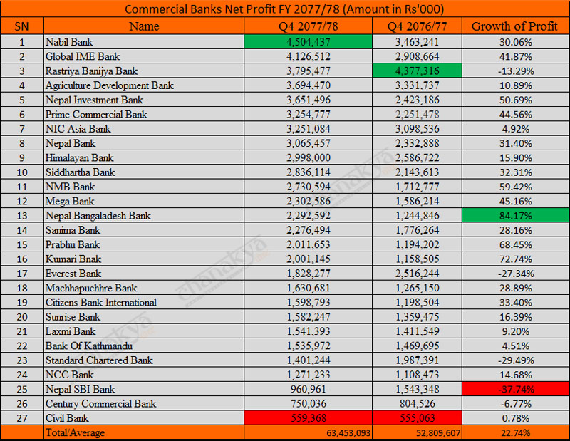 गत वर्षमा २७ वटा वाणिज्य बैंकहरुमध्ये २२ वटा बैंकहरुले नाफा बढाउन सफल भएका छन् भने ५ वटा बैंकको घटेको छ ।