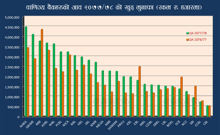 बैंकहरुले सार्वजनिक गरेको गत आर्थिक वर्ष २०७७/७८ को चौथो त्रैमासको अपरिष्कृत वित्तीय विवरण अनुसार खुद मुनाफा २२.७४ प्रतिशतले वृद्धि भएको हो ।
