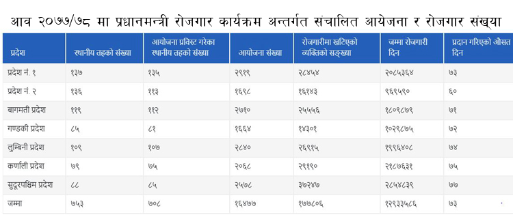 सरकराले गत आवमा २ लाख बेरोजगारलाई रोजगार दिने लक्ष्य राखे पनि १ लाख ७७ हजारले मात्र रोजगारी पाएका हुन् । सरकारले १६ हजार ४७० आयोजना संचालन गरी उनीहरुलाई रोजगारी दिएको हो । सो जनशक्तिहरुले कुल १ करोड २९ लाख १२ दिन ६९१ दिन काम गरेका थिए ।