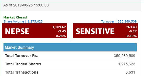 सेयर बजार मापक सूचक नेप्से ३.४५ अंकले घटेर १२०९.६२ विन्दुमा आइपुगेको छ । आज १७१ कम्पनीको १२ लाख ७५ हजार ६२३ कित्ता सेयर ३५ करोड २ लाख ६९ हजार ५०९ रुपैयाँमा खरिदबिक्री भएका छन् । कारोबार रकम बिहीबारको तुलनामा १० करोडले बढी हो ।