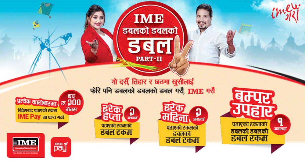 आइएमईले सार्वजनिक गरेको पर्व लक्षित डबल डबलको डबल अफर यही असोज १ देखि कार्तिक २६ गतेसम्म कुल ५७ दिनका लागि अहिले संचालनमा छ ।