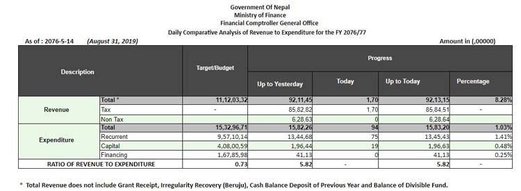 महालेखा नियन्त्रकको कार्यालयका अनुसार भदौ १४ गतेसम्म सरकारले कर शीर्षक अन्तर्गत ८५ अर्ब ८४ करोड ५१ लाख र गैरकर शीर्षक अन्तर्गत ६ अर्ब २८ करोड ६४ लाख रुपैयाँ राजश्व संकलन गरेको छ ।
