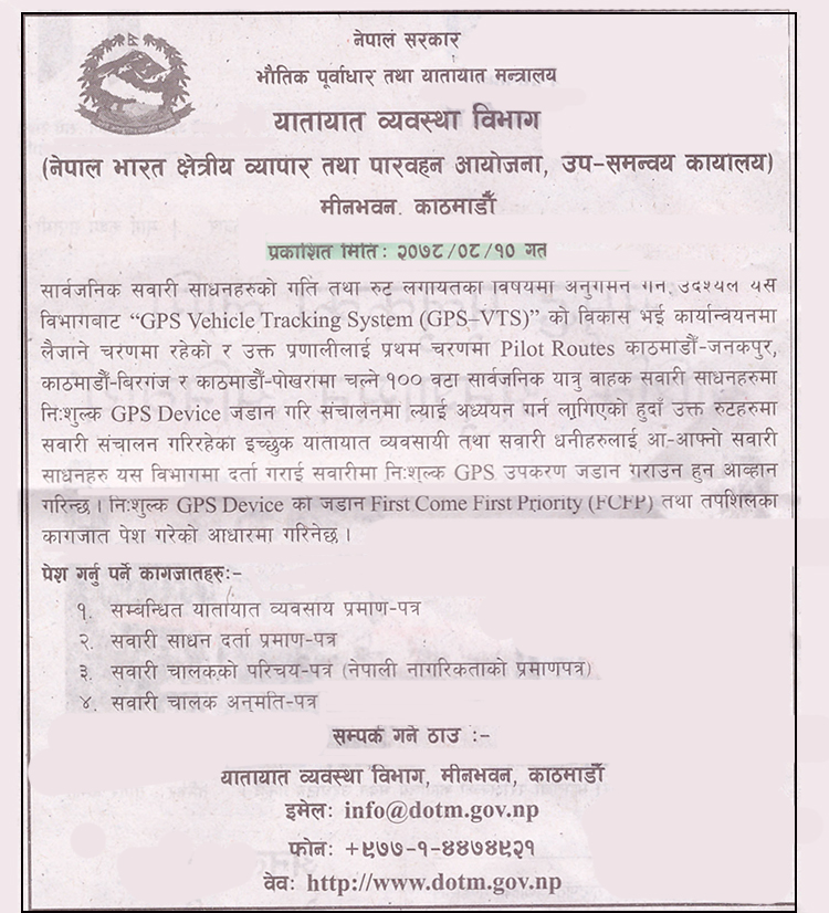 काठमाडौं । यातायात व्यवस्था विभागले १०० वटा सवारी साधनमा निःशुल्क जीपीएस जडान गर्ने भएको छ । विभागले परीक्षणका रूपमा सुुरुआतको चरणमा ‘फर्स्ट कम, फर्स्ट सर्भ’का आधारमा १०० वटा सवारीमा निःशुल्क सेवा दिएर प्रोत्साहन गर्ने योजना गरेको हो ।