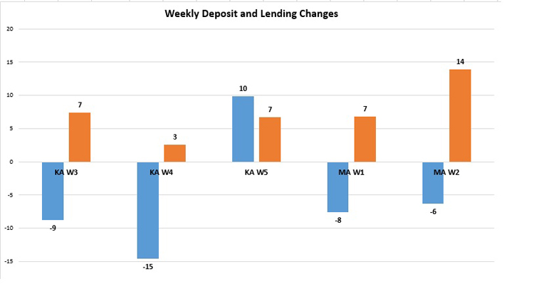 यस्तै मङ्सिर ३ गतेसम्म ४० खर्ब ४१ अर्ब बराबरको कर्जा लगानी गरेका वाणिज्य बैंकले मङ्सिर १० गतेसम्म आइपुग्दा ४० खर्ब ५५ अर्ब बराबरको लगानी गरेका छन् । यस आधारमा एक सातामा नै १४ अर्ब बराबरको कर्जा लगानी भएको देखिन्छ ।