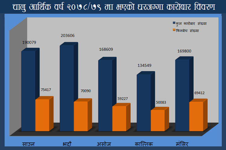 विभागका अनुसार चालु आवको असोजमा १ लाख ६८ हजार घरजग्गा कारोबार भएको थियो भने भदौमा सबैभन्दा धेरै २ लाख ३६ हजार कारोबार भएको थियो । त्यस्तै, साउनमा १ लाख ६८ हजार घरजग्गा कारोबार भएको विभागको तथ्यांक छ । सोमध्ये साउनमा ७५ हजार, भदौमा ७० हजार र असोजमा ५९ हजार घरजग्गा खरिदविक्री भएका छन् ।