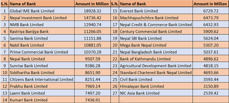 त्यस्तै, नेपाल बैंक ९ अर्ब ५० करोड, सनराइज ९ अर्ब ३८ करोड, सिद्धार्थ, ८ अर्ब ६५ करोड, सिटिजन्स ७ अर्ब ९६ करोड र लक्ष्मी बैंकले ७ अर्ब ४९ करोड रुपैयाँ ऋण लगानी गरेका छन् ।