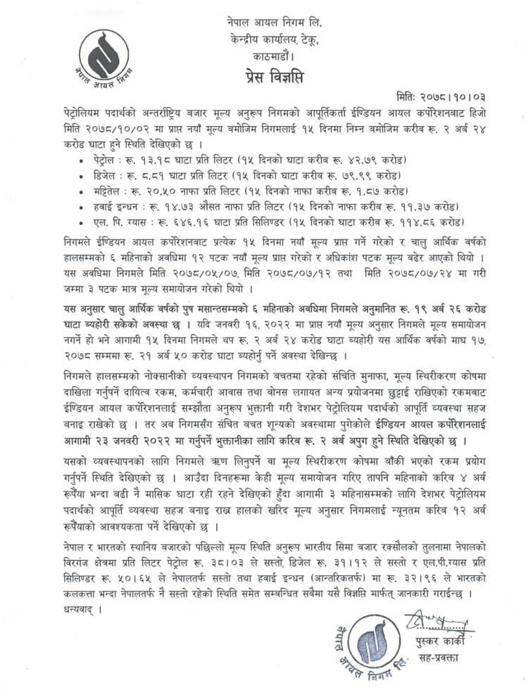 इन्डियन कर्पोरेसनबाट आइतबार प्राप्त नयाँ मूल्य अनुसार अब निगमले मूलय समायोजन नगरेमा आगामी ३ महिनामै १२ अर्ब ऋण लिनुपर्ने अवस्था आउने निगमले जनाएको छ ।