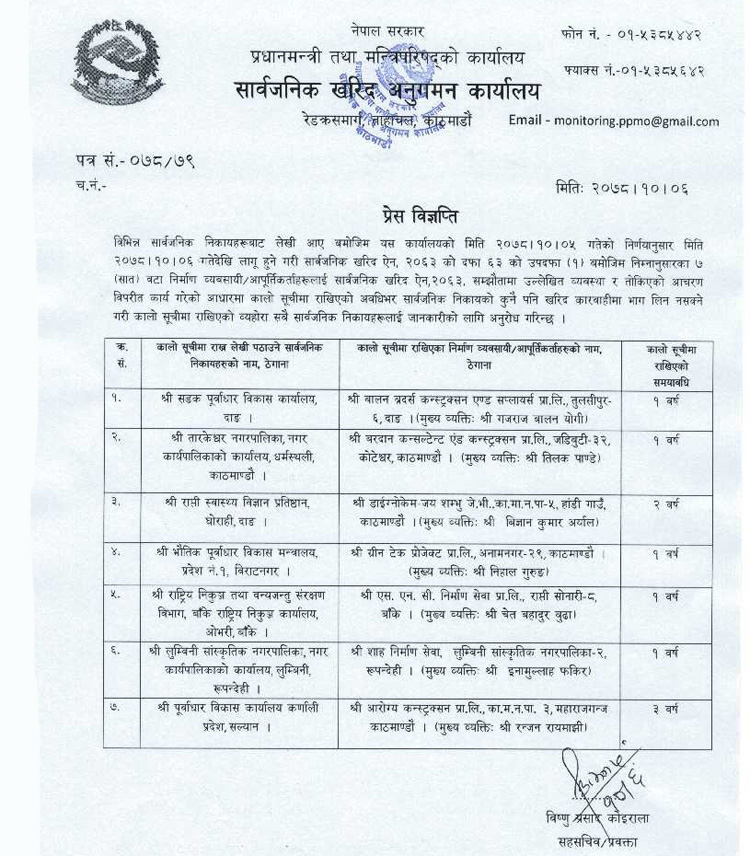कर्णाली प्रदेशको सल्यानस्थित पूर्वाधार विकास कार्यालयको सिफारिसमा काठमाडौंको महाराजगन्जस्थित आरोग्य कन्स्ट्रक्सन प्रालिलाई ३ वर्षका लागि र दाङको घोराहीस्थित राप्ती स्वास्थ्य विज्ञान प्रतिष्ठानको सिफारिसमा काठमाडौंकै हाँडीगाउँस्थित डाइग्नोकेस जय शम्भु जेभीलाई २ वर्षका लागि कालोसूचीमा राखिएको हो।
