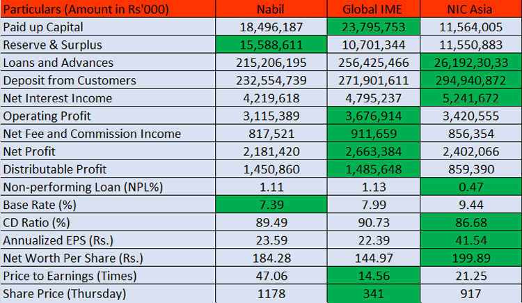 चुक्ता पूँजी, संचालन नाफा, खुद नाफामा ग्लोबल आइएमई बैंक शीर्ष स्थानमा रहेको छ भने निक्षेप संकलन, कर्जा लगानी, खुद ब्याज आम्दानी, प्रतिसेयर नेटवर्थ लगायतमा एनआइसी एशिया बैंक अघि रहेको छ । जगेडा कोष भने नबिल बैंकको बलियो रहेको छ ।