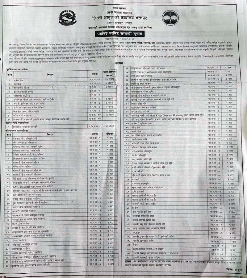 काठमाडौं । भक्तपुर जिल्लामा योजना अनुमति नलिइकन धमाधम प्लटिङ भइरहेको पाइएको छ । अनुमति बिनै ९२ ठाउँमा प्लटिङ भएपछि सरकारले ती ठाउँको जग्गा नकिन्न सर्वसाधरणलाई आग्रह गरेको छ ।