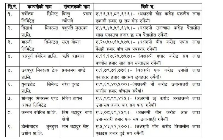 यस्तै, मारुती सिमेन्टका सञ्चालक शरद गोगलविरुद्ध २० करोड ५० लाख ६५ हजार ५७५, अन्नपूर्ण क्वेरिजका सञ्चालक ऋषी अग्रवालविरुद्ध ११ करोड १७ लाख २५ हजार ७५७ बराबरको बिगो माग दाबी गरिएको छ । यस्तै, उदयपुर मिनरल्सका सञ्चालक प्रवलजङ्ग पाण्डेबिरुद्ध १ करोड ७९ लाख ७१ ह्जार ७७६, युनाइटेड सिमेन्टका सञ्चालक नरेश दुगडविरुद्ध ९करोड ६९ लाख ४० हजार ५००, सोनापुर सिमेन्टका सञ्चालक निपेश तायलविरुद्ध ६ करोड ९८ लाख ९९ हजार ४१५, कञ्चन क्वेरिजका सञ्चालक भीमबहादुर थापा क्षेत्रीविरुद्ध ३ करोड ८ लाख ६९ हजार १५९ र डोलोमाइट चुनढुङ्गा उद्योगका सञ्चालक मानबहादुर श्रेष्ठविरुद्ध ५ करोड ४३ लाख २१ हजार २०० बराबरको बिगो दाबी मुद्दा दायर गरिएको छ ।