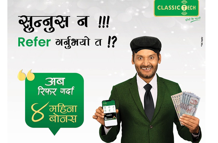 काठमाडौं । क्लासिक टेकले इन्टरनेट जडानका लागि अन्य व्यक्तिलाई रिफर गर्दा ४ महिनासम्म बोनस दिने भएको छ । पछिल्लो समय आक्रमक रुपमा व्यवसाय विस्तार गरिरहेको कम्पनीले यस्तो योजना ल्याएको हो ।