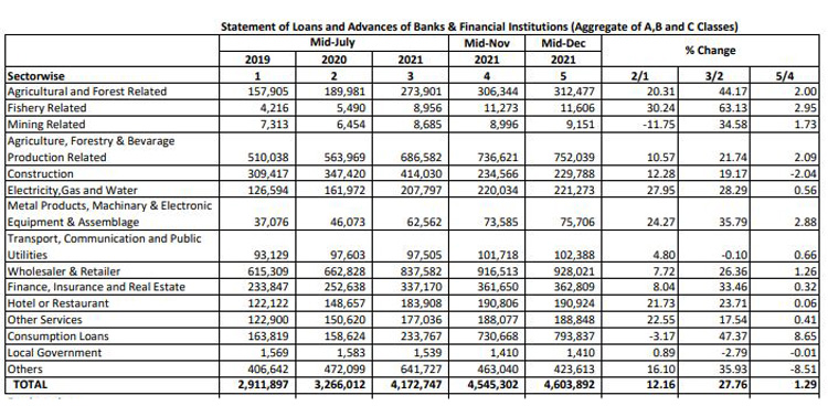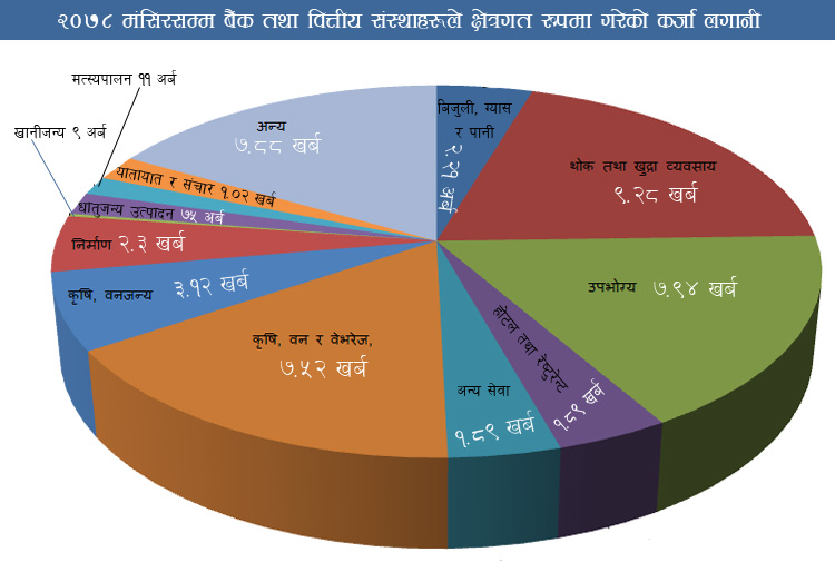 बैंक तथा वित्तीय संस्थाहरूले वित्त, बीमा र अचल सम्पत्तिमा मात्रै बैंकहरूले ३ खर्ब ६२ अर्ब लगानी गरेका छन् । मंसिरसम्म माछापाल व्यवसायमा ११ अर्ब २७ करोड, खानी जन्य उद्योगमा ९ अर्ब १५ करोड, निर्माण उद्योगमा २ खर्ब २९ अर्ब, जलविद्युत् तथा ग्यासजन्य उद्योगमा २ खर्ब २१ अर्ब कर्जा प्रवाह गरेका छन् ।