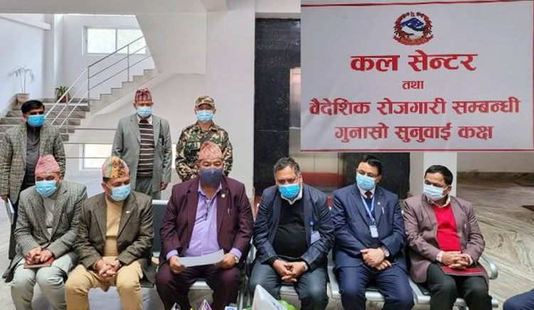 काठमाडौं । वैदेशिक रोजगारीमा जानेका गुनासो तथा प्रश्नहरुके सुनवाइ गर्न श्रम, रोजगार तथा सामाजिक सुरक्षा मन्त्रालयले कल सेन्टर तथा वैदेशिक रोजगारी सम्वन्धी गुनासो सुनुवाइ कक्ष स्थापना गरेको छ । श्रम, रोजगार तथा सामाजिक सुरक्षामन्त्री कृष्णकुमार श्रेष्ठले कक्षको उद्घाटन गरेका हुन्।