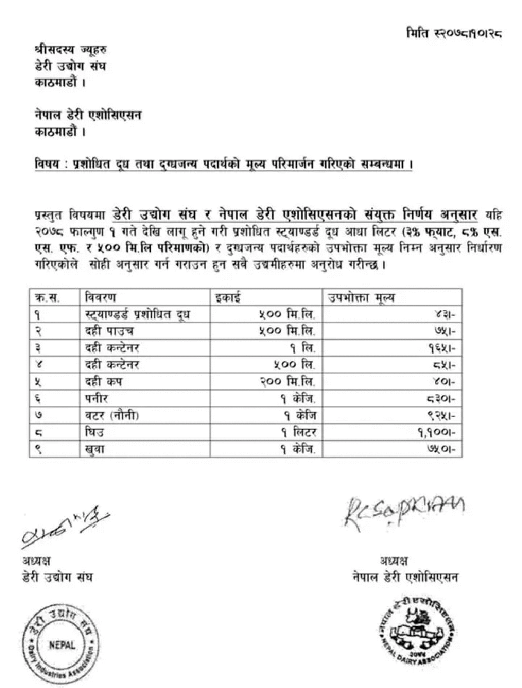 डेरी उद्योगीको छाता संगठन नेपाल डेरी उद्योग संघ र नेपाल डेरी एसोसिएसनले संयुक्त रूपमा मूल्य बढाए सँगै दूधजन्य पदार्थमा प्रतिकेजी लिटर ५ रुपैयाँदेखि १०० रुपैयाँसम्म मूल्य वृद्धि भएको छ ।