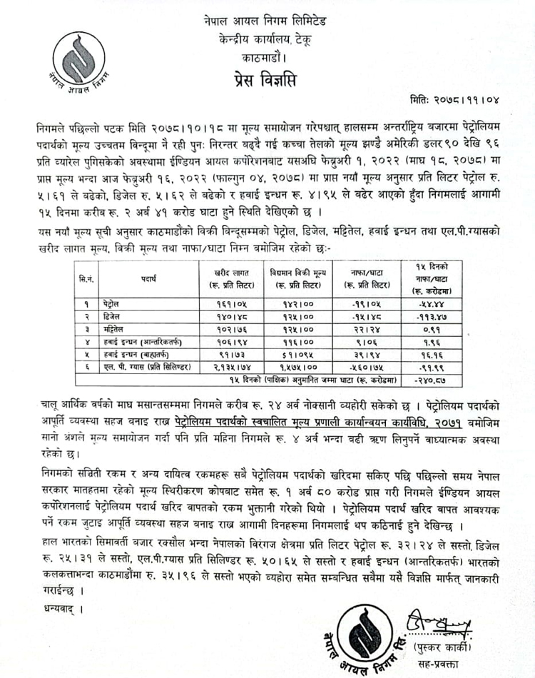 बढेर आएको मूल्य अनुसार आगामी १५ दिनमा करिब २ अर्ब ४१ करोड घाटा हुने देखिएको निगमले जनाएको छ । निगमका अनुसार चालु आर्थिक वर्षको माघ मसान्तसम्ममा मात्र निगमले करिब २४ अर्ब नोक्सानी बेहोरिसकेको छ ।