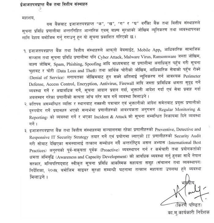 बैंक तथा वित्तीय संस्थाहरुलाई आफ्नो वेवसाइट, मोबाइल एप, सामजिक सञ्जाल, वालवेर भाइरस, र्यानसोमवेरजस्ता बाह्यीय जोखिम नियन्त्रका लागि सचेत हुन सुझाव दिएको छ।