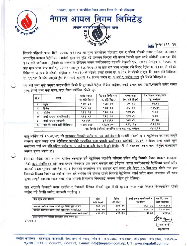 आइओसीले निगमलाई आज (फागुन १७ गते)पेट्रोलियम पदार्थको मूल्य बढेको पत्र पठाएको हो । रुस र युक्रेनबीचको तनाव समेतका कारणबाट अन्तर्राष्ट्रिय बजारमा पेट्रोलियम पदार्थको मूल्य थप वृद्धि हुँदा नेपाल पठाउने इन्धनको मूलय पनि बढेको आइओसीले पठाएको पत्रमा उल्लेख छ।