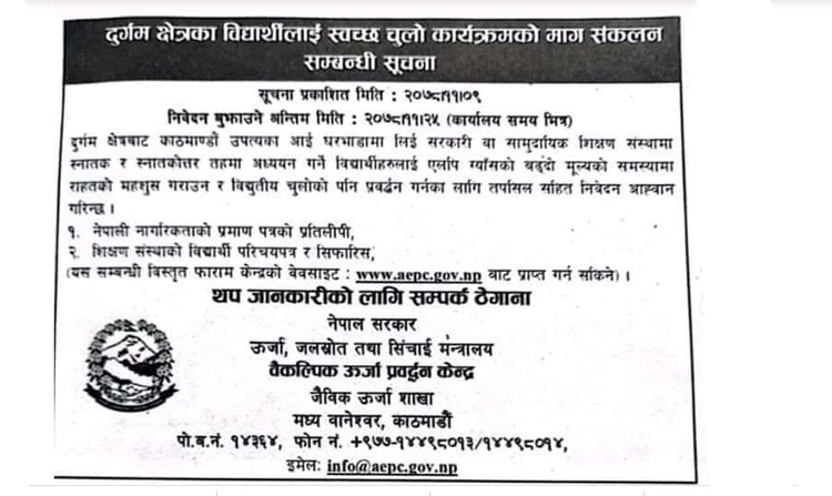 तोकिएको शर्त पुग्ने विद्यार्थीहरुले यही फागुन २५ गतेसम्म आवेदन दिन सक्ने केन्द्रले जनाएको छ । साथै यस सम्बन्धी विस्तृत जानकारी फारम केन्द्रको वेबसाइटमा उपलब्ध छ ।